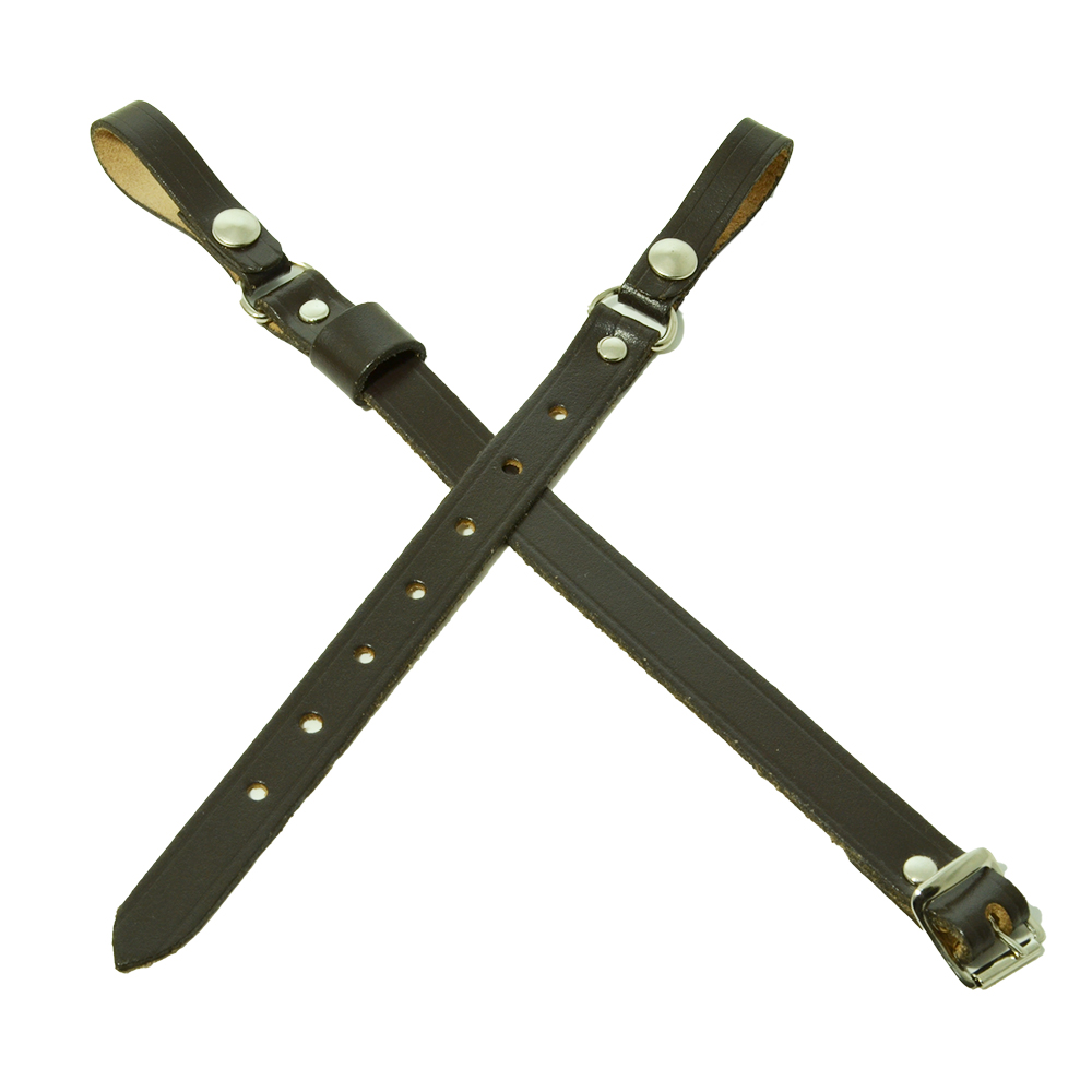 This genuine leather Strap is available in black and brown. There are two straps that are 3/8″ wide. The ends are 3/8″ wide with a snap-type swivel and closure. One of these straps comes with a keeper which together make 3 pieces. The purpose of this strap is to typically hold a 1 Piece Strap or a Set of Cords to a hat. In most cases the 3 piece strap is worn in the back of your head.