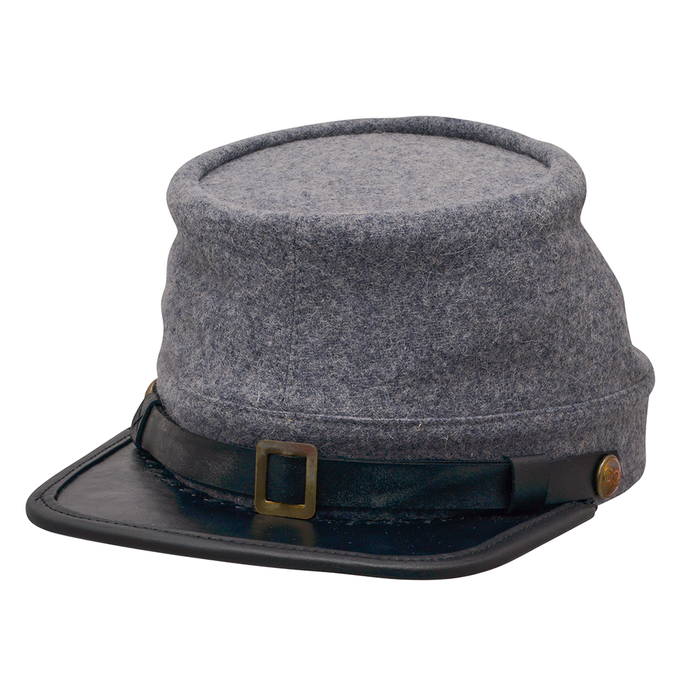 Note: Our famous kepi is handmade with the best materials. Durable wool, heavy leather brim, brass side buttons and center buckle, leather sweat band and they are lined with cotton material. This men's civil war cap is perfect for the civil war enthusiast and for reenactment events