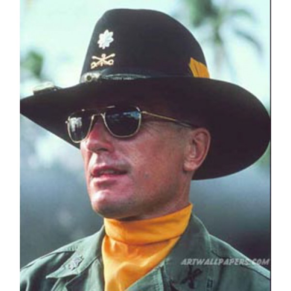 Note: The 1776 Cavalry Hat is the authentic replica of the Lt. Kilgore Cavalry Hat seen in "Apocalyse Now". After extensive research Miller Hats created a style that we feel best fits the one worn in the movie. We recommend the black color, 3 1/2" turn down brim, 4 5/8" center crease crown, 1" grosgrain band, 9th cavalry saber hat pin (1047), Lt. Col Rank silver (628), a feather, black/gold acorn band (521) and a black 3 piece strap for the authentic Kilgore look. If you are a Cavalry hat enthusiast this is the perfect hat for you. The Lt. Colonel Kilgore Cavalry Hat was designed by us with the understanding that quality comes first. This hat comes with an inside leather sweat band, it has a cavalry sabers satin liner and it's made in the U.S.A. This hat is very popular amongst cavalry troops and military personnel. Item is in stock ready to ship. Click here to watch a video of the authentic Lt. Colonel Kilgore Hat.